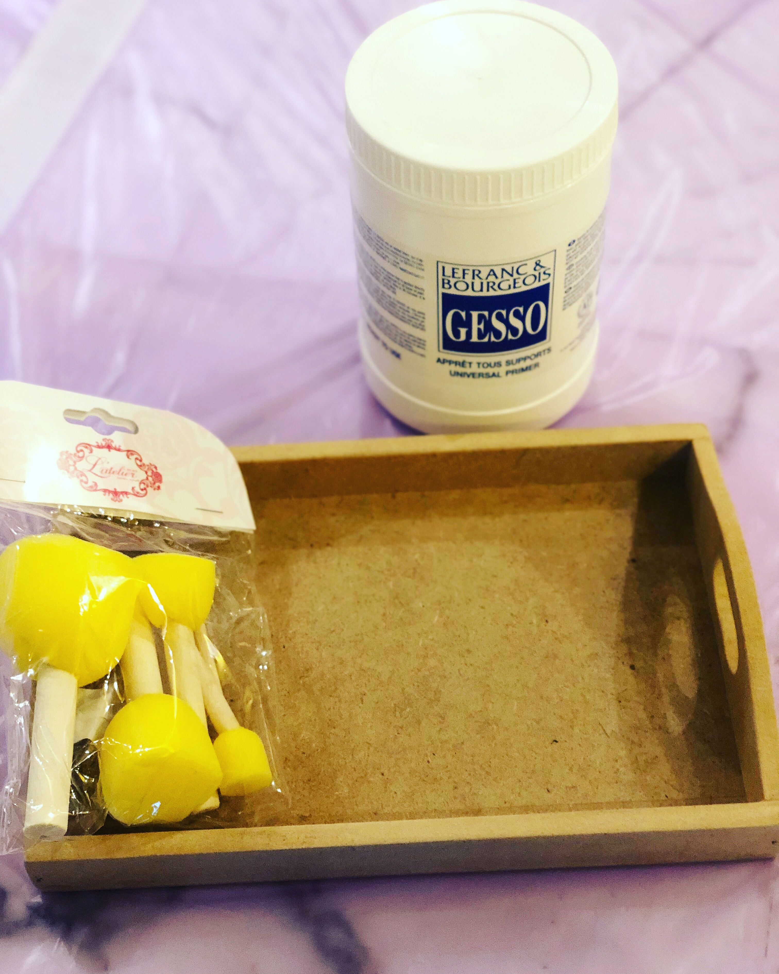 2. After sanding, it is always advisable to prime the surface. My favourite is the ‘Gesso Primer’, most commonly used to prepare surfaces for oil and acrylic painting. And since I usually use acrylics, it works just fine! Ideally two layers of gesso for surface preparation are perfect with a 30 minute- 1 hour wait to allow drying in between the layers. Both sponges and paint brushes may be used for the purpose – If the surface has corners and edges (like in trays and shelves), I prefer to use paintbrushes as it is easier to reach the corners for a smooth covering. For flat surfaces like coasters, sponges work perfectly too. The purpose of this step is to prevent the paint layers (later) from seeping in too much and also to help the layers adhere onto the surface better.