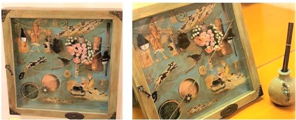 I use decoupage as a base for my pieces and then to make them 100% waterproof I embellish with Acrylic paints, wax pastes finally coating with thick water proof varnish layers – subsequently making them potential heirlooms! Each of my creations presents a story in itself – it must never be out of any context at all! After all, tis the era of personalizing, storytelling and emanating a nostalgic, cozy, snug and homey vibe! This one in particular (see above) is closest to my heart – mainly because it’s based on the Japanese design philosophy of ‘wabi-sabi’ – beauty in the imperfect, incomplete and the impermanent. As I studied more of it for my thesis which was part of the Master’s degree in interior design, it grew on me and I started identifying more and more with it. That is when I attempted to encapsulate the gist of this beautiful philosophy in the form of this ‘shadow box wall hanging’. Some of the core spiritual pillars of the primitive/ancient Japanese ideology and belief include the belief in harmony, respect, purity, tranquility, anti-rationalism, transcendental truth and leading an unencumbered life. This shadow box in particular, attempts to embody the essence of the ancient ‘Japanese tea house’ – the Japanese tea ceremony in spirit, principle and as a moment in time creating experience. The tea-making process itself is as simple as fetching water, collecting firewood for boiling, preparing tea and ultimately serving it. Instead of expensive/conventionally beautiful utensils, warm bamboo tea scoops made of virtue of their age for example, and handcrafted bamboo vases are employed; a whiff of the ‘perfectly imperfect’, ‘age’ and ‘patina’. A successful ceremony is to leave its participants with a feeling of ‘jaku’ – tranquility and ‘Sei’ –Purity.
